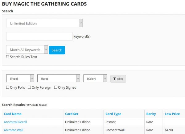 I’ve used this sorting feature multiple times to browse for underpriced copies of a card of a given rarity and particular set. The more obscure the set, the more likely you can find some steals. Not long ago I noticed there were a bunch of Collectors’ Edition cards below buylist, and I suspect some Unlimited cards in stock are priced attractively given the recent run on cards from that set. Check it out—it costs nothing to sign up and browse!