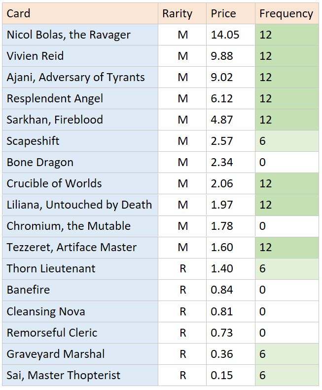A few things pop out. First is that Bone Dragon and Chromium, the Mutable are the big winners in the mythic category. Cards with less demand than those two are having an additional infusion of supply, and this makes me happier about my Chromium speculation recommendation a month ago. Second is that Crucible of Worlds and Scapeshift are going to continue to have supply pumped into the market, so I would steer clear of these cards and would sell any excess copies I have (I'm surprised these two were added to the chests despite the Core 19 reprinting. The opposite approach was employed with Masters 25 cards).
