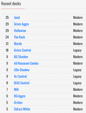 The Pauper Delver deck is mislabeled– should be UB Delver, not Grixis Delver. I don’t think I have ever seen a three-color Delver deck in Pauper. (Only a few Pauper decks can afford to run three colors, usually Affinity or Tron, due to being able to benefit from cards such as Prophetic Prism, Springleaf Drum, and Chromatic Star.)