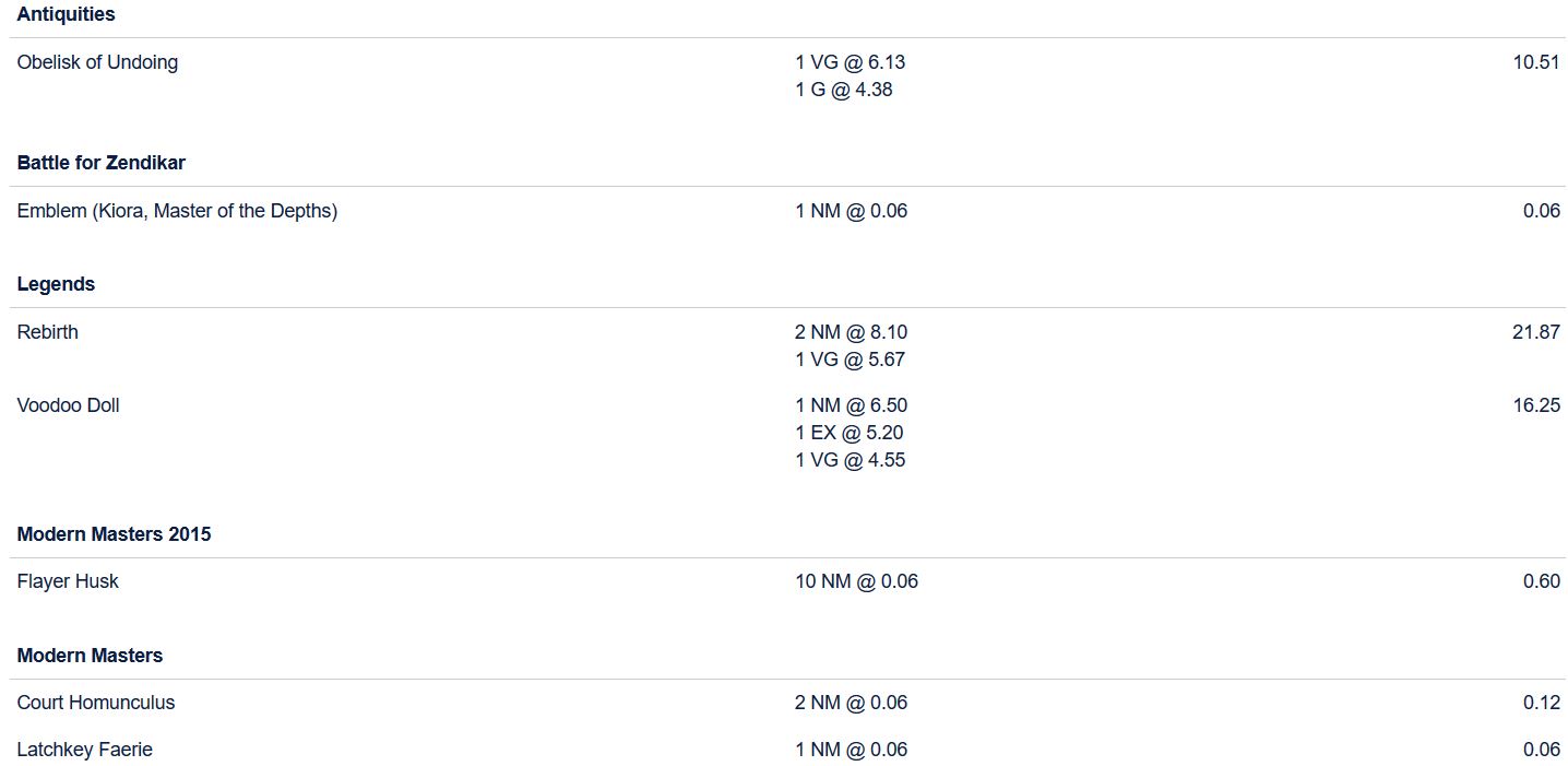 This buylist order contains cards that fit three categories. Category one is my Old School pile, consisting of nearly unplayable Antiquities and Legends cards that spiked for speculative reasons. Obelisk of Undoing, Voodoo Doll, and Bishop of Rebirth all buylist to Card Kingdom for less today than they did back in February, so these were great moves. Again, other stores may pay more for these cards but I have limited experiences selling to them.
