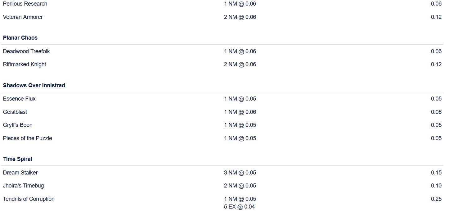 This was an all gold-bordered buylist order. Selling these cards to Card Kingdom today would net $2.50 per Glimmervoid, $4.00 per Grim Monolith, and $5.00 per Mystical Tutor. Since this buylist order was placed so recently, in late December, it’s possible that my submission impacted their current buy numbers. So making the comparison is unfair.