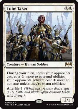 This might be a better fit in Modern Humans than Priest of Forgotten Gods. Keep in mind that it only triggers when you cast a multicolored spell though, so it might not be good enough because of Aether Vial. But let's at least look at what cards this works with...Meddling Mage, Reflector Mage, Mantis Rider, Tajic, Legion's Edge, Knight of Autumn, Sin Collector, Kambal, Consul of Allocation, Gaddock Teeg, and Izzet Staticaster. Half of those are sideboard cards, so I don't think this will make the cut. It does make a Human token though, so I think people will test it at the very least.
