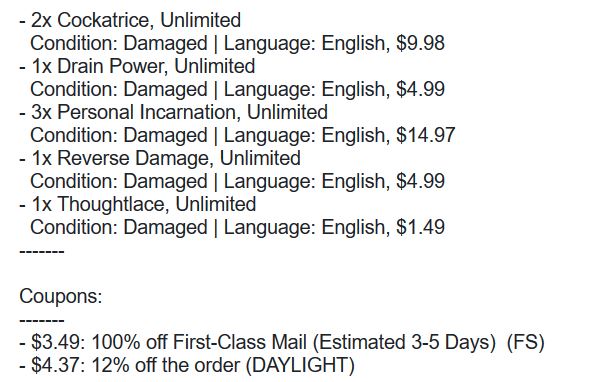 It’s not the most exciting of orders, but I flipped these low-end Unlimited rares to ABUGames for more than double what I paid in store credit. Granted an ABUGames buck is worth around $0.65-$0.70 in real money. But if I can acquire ABU bucksTM for $0.50 on the dollar and use credit to cash out at $0.70 on the dollar, the delta is a reasonable margin—especially when combining orders to save on shipping.