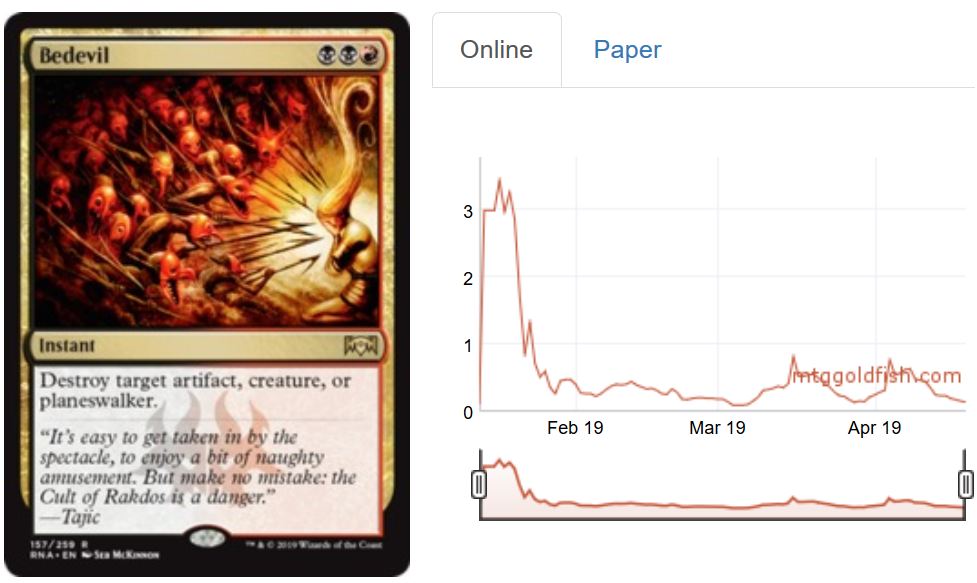 Despite Theros flooding the market with Hero's Downfall as if straight of out Genesis 7, Hero's Downfall generally held steady between $2.00 and $4.00 during Theros-Khans Standard. Bedevil has settled slightly above bulk because Rakdos as a color combination has found no home in the Standard metagame. I expect that to change after WAR releases, and of course who knows what the Standard landscape next rotation will bring.