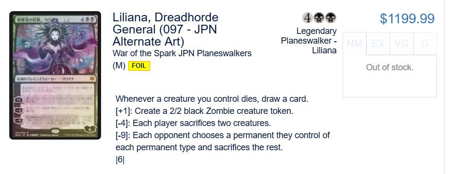 Lastly, if you want to play it safest of all, you could purchase a few Japanese War of the Spark booster boxes to sit on. I personally don’t deal in sealed product anymore because storing and shipping them is a major pain. It looks like there are numerous boxes for sale on eBay from Japanese sellers, with prices that hover around $165. I’m not a gambling man, but cracking one of those foil Lilianas in a $165 box seems like the ultimate Magic payout. Who knows how many people will be willing to take that gamble a few years from now?