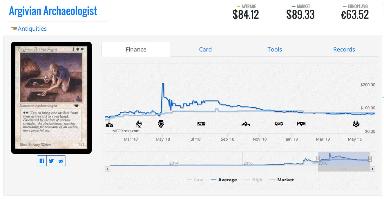 The card barely budged in price for many years. Then during the Reserved List rush of 2018, it spiked from $90 or so to north of $200. From there, the spike retracts, just like we saw with Bearscape last week. But instead of fully recovering in a week, we see in this case a short-term retraction followed by a long-term sell-off. Two weeks after the May 2nd spike, Argivian Archaeologist was already back down to $130 or so. Fast forward a year, and the card gradually settled right back down to its previous pre-spike price.