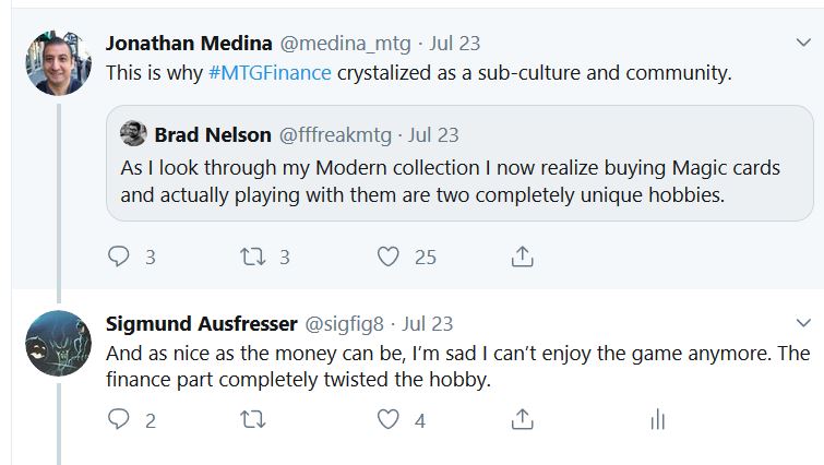 This is a bold statement to kick off an article on a website about MTG finance, but it’s my solemn realization. I think it’s been this way for a year or two now, but it’s only now sinking in that the game itself no longer exists for me. Brad Nelson (@fffreakmtg) put it best on Twitter recently, and Jonathan Medina (@medina_mtg) helped emphasize the point.