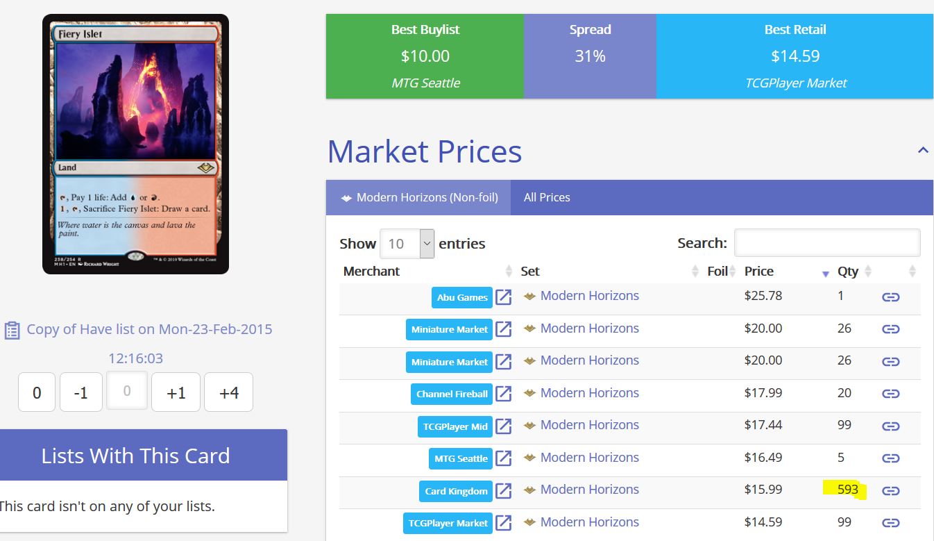 How do I define “more than enough”? This is admittedly a loose, unquantifiable term. In reality, the quantity is going to vary significantly from card to card. But if you check out Quiet Speculation’s Trader Tools website (mtg.gg) you can view the precise quantity Card Kingdom has in stock. For example, it appears they have 593 copies of Fiery Islet in stock.