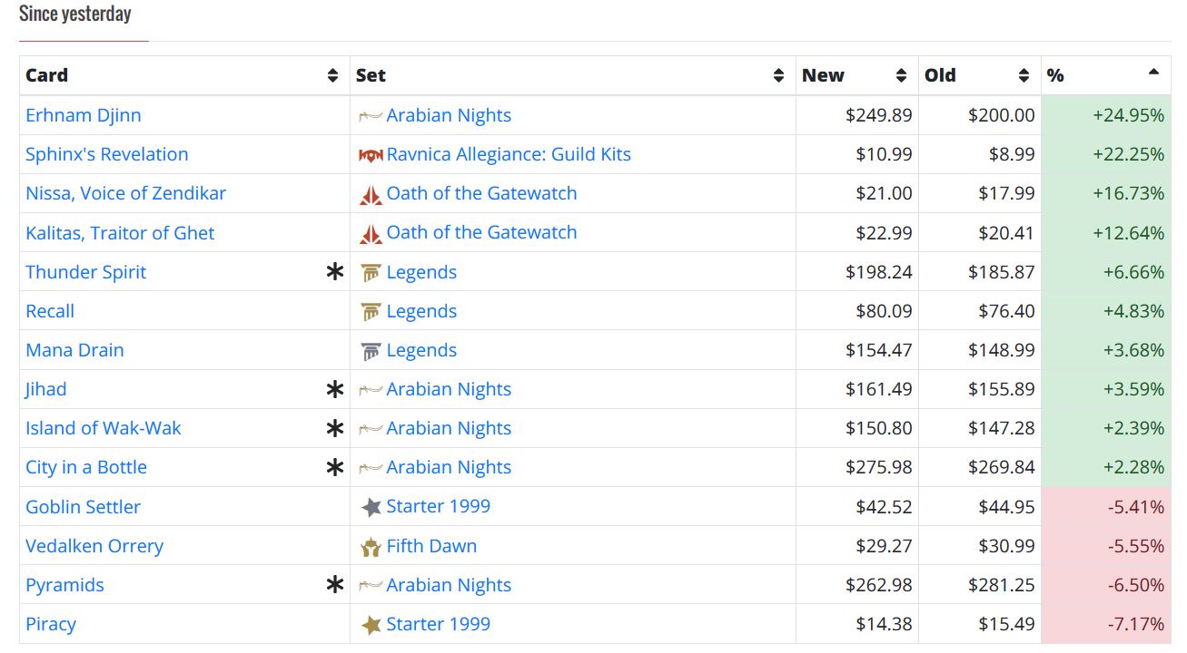 That’s it. The entire Interests page for nonfoils from Sunday, November 9th. Let’s count the Standard cards that appear on the list: zero. In fact, I see three cards moving due to Pioneer, and then the usual noise that is the Old School market (prices fluctuate, but never go anywhere).