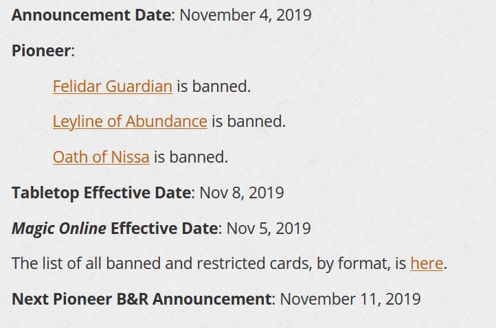This could hamper the growth of Pioneer out the gate, and it makes me want to remain hands-off as a speculator (I already got burned on a few Oath of Nissas. I’m not in the business of buying popular cards only to have their utility squelched during a weekly banning. I expect this will leave some sour tastes in players’ mouths, and it’ll be interesting to see if there are any longer-lasting implications.