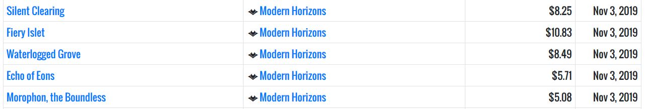 Lastly, there are the rare lands of Modern Horizons. You have Prismatic Vista at $30 and the five Horizon Canopy lands. These will all experience sustainable demand in time, but are suffering from soft demand in the short term. Eventually these will be a buy—you just need to pick the price you’re comfortable paying and be content to wait a while.