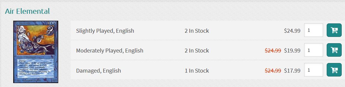 So we have Slightly Played Beta Air Elemental listed at $24.99, that’s not too bad. Moderately played copies are marked down $5 to $19.99. Wait a second… shouldn’t MP copies be cheaper than SP copies? How is that a markdown? It looks like they’re just using the SP price over and over again, and then crossing it out and putting the actual price. No one would pay $24.99 for a damaged copy, so that $7 discount isn’t really a discount.