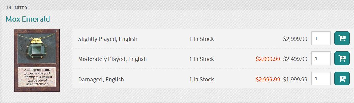 Look at that $1000 markdown on damaged copies of Unlimited Mox Emerald! It looks like a deal. However, I've seen these sell for $1400-$1500 on social media recently.