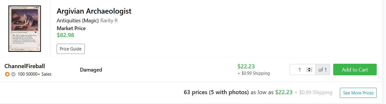 This is another steal if you’re looking for a sleeve playable copy of Argivian Archaeologist. It’s not a copy that’ll likely get a collector’s interest, but it could be the perfect copy to jam in an Old School deck! It could also be used to flip to ABUGames for trade credit—they offer $40.46 in trade credit for HP copies of this card.