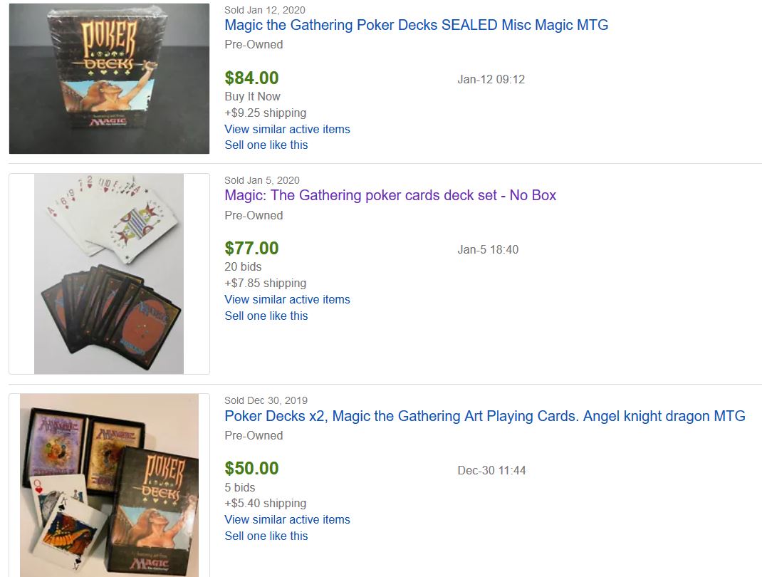 There was a hot minute when these were selling for a higher price—it was shortly after Rudy of Alpha Investments made a video about this game. A few decks sold in the $200-$300 range. At the time, I remember declining an offer of around $700 for my three decks. In hindsight, I should have accepted the offer since these have dropped back down to their old price. But I’m a pretty big fan of this obscure product, so I’m happy to keep these (now I own 5) decks for a rainy day.