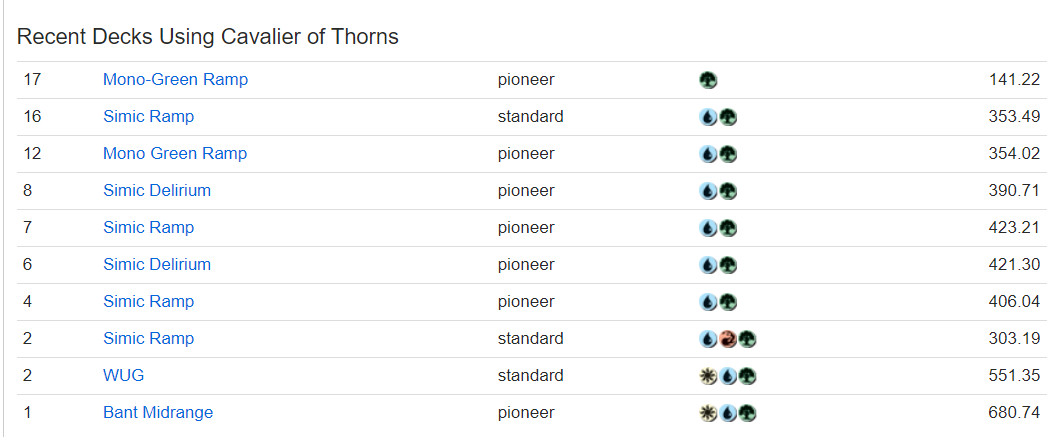 mtggoldfish and lookup Cavalier of Thorns, we can see that it's currently finding a home in Standard and Pioneer decks. However, we aren't seeing it much in Modern, Legacy, or Vintage. We can therefore assume those segments are very small or nonexistent. We can then check EDHRec to see how often it shows up in Commander decks.