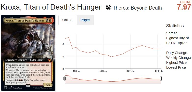 Of the mythics in this class, Kroxa is the one I least like as a speculation target. It takes significant demand to sustain an $8 price tag, and my worry is that Kroxa is just a little too derpy and inefficient to really breakout in any format. It's more of a potent filler piece than a card to build around, and that scares me a bit. The main argument in its favor is that its demand is highest in Modern, and Modern is due for a resurgence in the coming months. This might be one to revisit if its price declines.