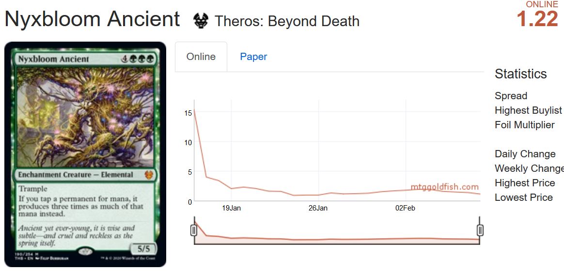 Unlike those ranked beneath it, I expect Nyxbloom Ancient to maintain its value thanks to high demand amongst the Magic Online Commander community. I also believe there is a slight chance that Nyxbloom Ancient finds its way into Standard depending on what gets printed in future sets. With that said, this does not strike me as a card to invest in, as it is highly likely to remain stagnant.