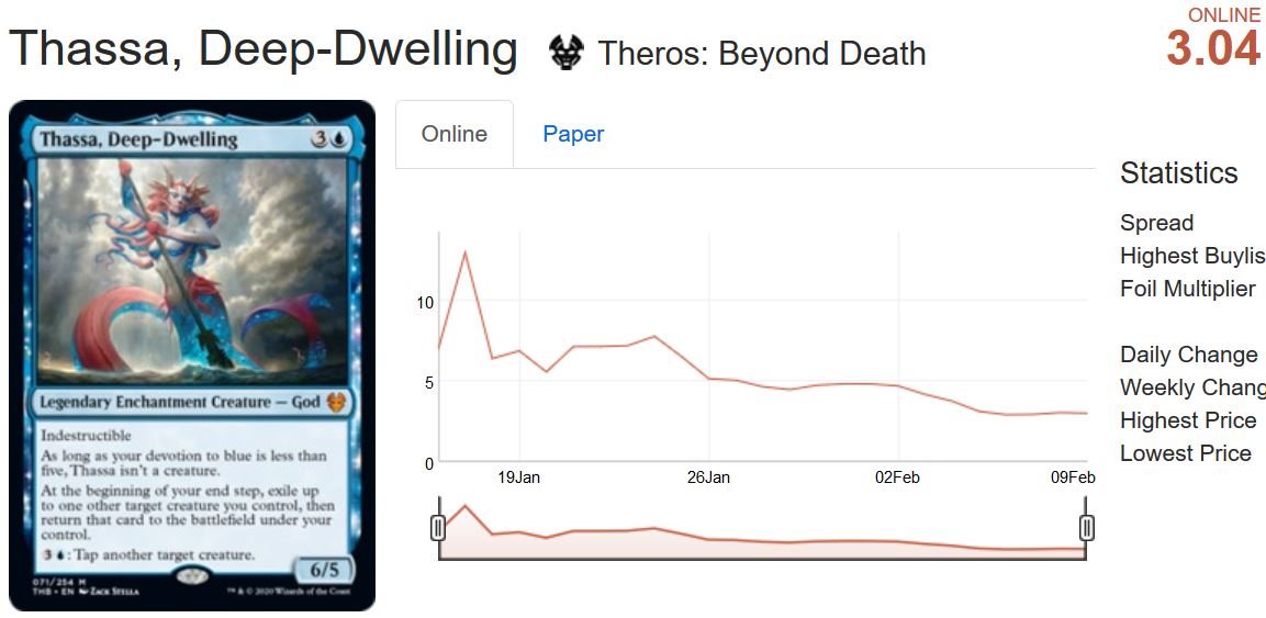 Thassa is a powerful card that is seeing play in Standard and Pioneer. An indestructible blink-engine is a unique tool for Constructed, and I expect competitive players to find new ways to abuse her as time goes on. Put differently, this is a card with high potential, and I like buying in at what will possibly be her floor.