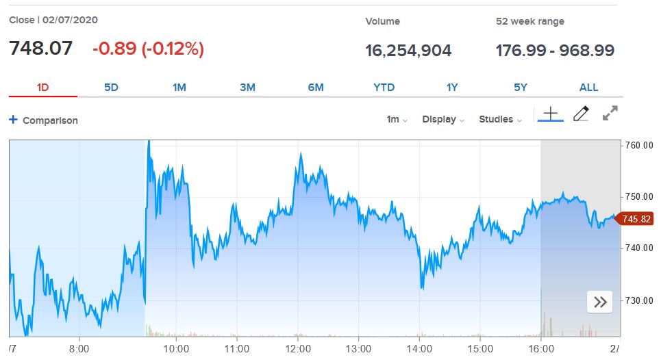 What fraction is it? We have no clue! That’s the second fundamental difference between the stock market and the Magic market. Let’s rewind back to that Tesla stock chart I showed for February 7th.