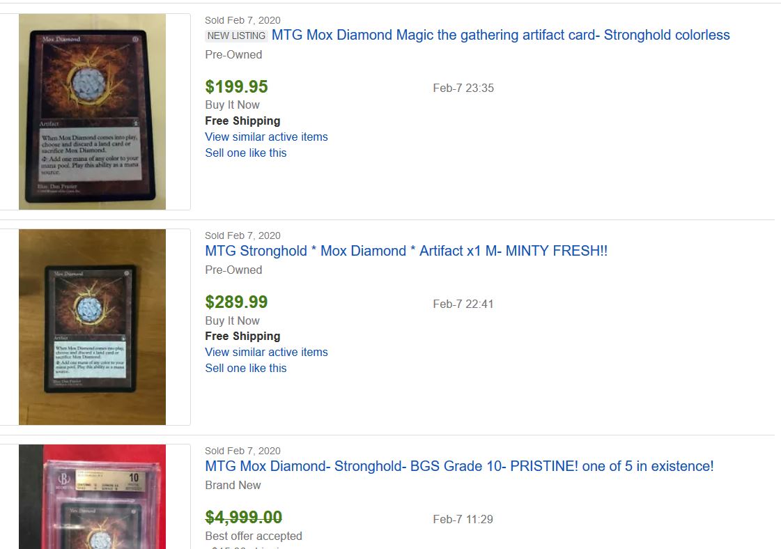 But how useful is eBay’s data, really? Take a look at the last three sold listings for Mox Diamond and tell me what it’s worth…