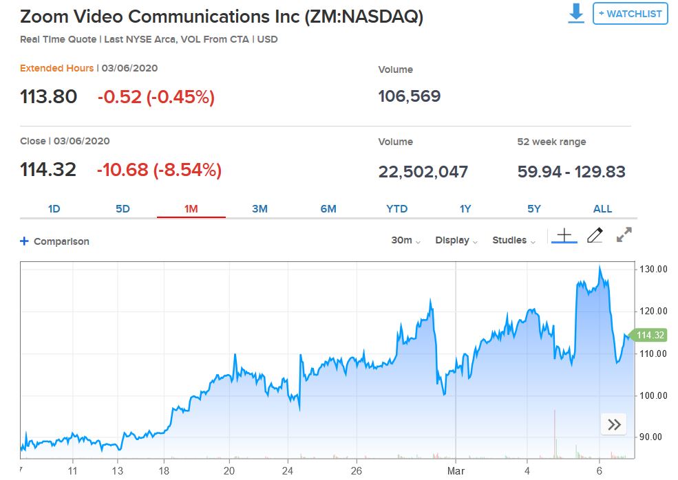 Does this look familiar? Zoom’s stock had gone from $90 to $130 in just a couple weeks as the virus began to spread. Don’t forget, the stock market is down over 10% in that same time frame! Over the last couple days, the stock sold off sharply, giving back some of its gains. This volatility is being driven by hype (articles written about the stock) and speculators grasping at a singular thesis.