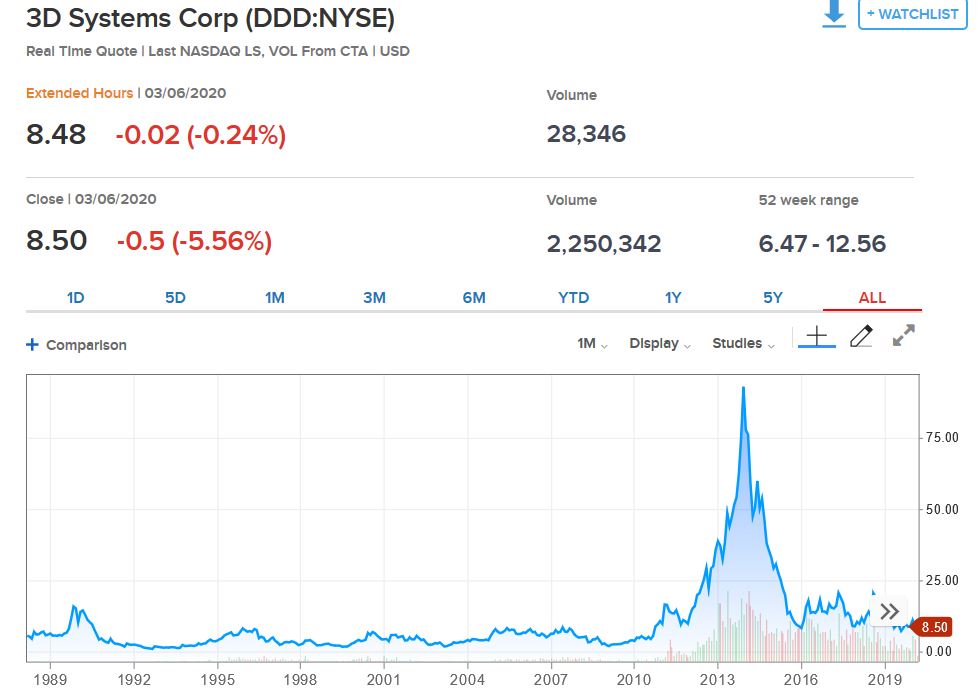 Stock market speculation happens more often than you’d think. I’ve seen the same hype-train take off with various trends: solar energy, marijuana, and 3D printers. Check out the price chart on 3D Systems (DDD). Talk about hype!