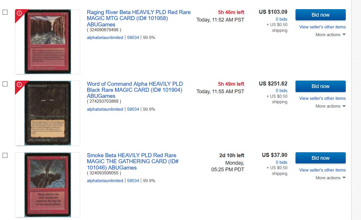 Rather than share new buylist prices on Card Kingdom’s site, I want to flag an ongoing phenomenon I’ve noticed with ABUGames. They continue to sell Old School cards on eBay via auction. They start the bidding high and if the card doesn’t sell, they re-list for approximately 10% less. They do this every few days until the card does sell. This is essentially a Dutch auction style, and it can lead to some attractive prices on less-than-playable cards.