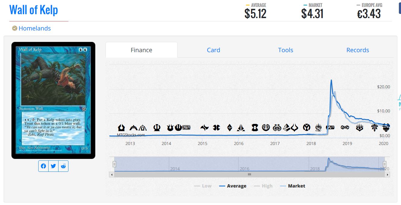 But, just like with 3D Printing, people quickly learned Wall of Kelp was not the second coming of Rhystic Study, and the card plummeted back down to a reasonable $5 (it’s still arguably the most valuable card in Homelands, next to Didgeridoo and Koskun Falls).