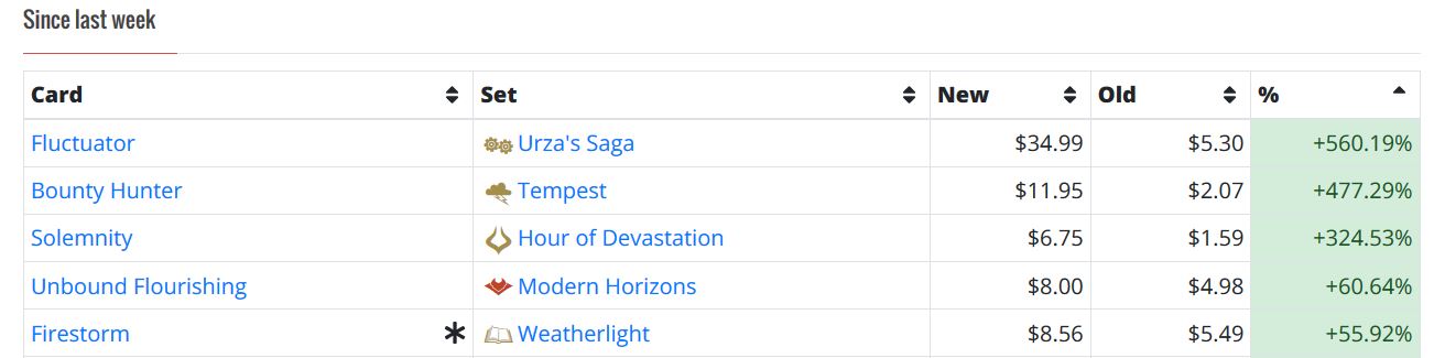 Now, during this uncertain time, I view buyouts differently. They are a reflection of buyer confidence, normalcy, and sufficient liquidity. I get excited when I see a sudden 500% increase on Urza’s Saga artifact Fluctuator.