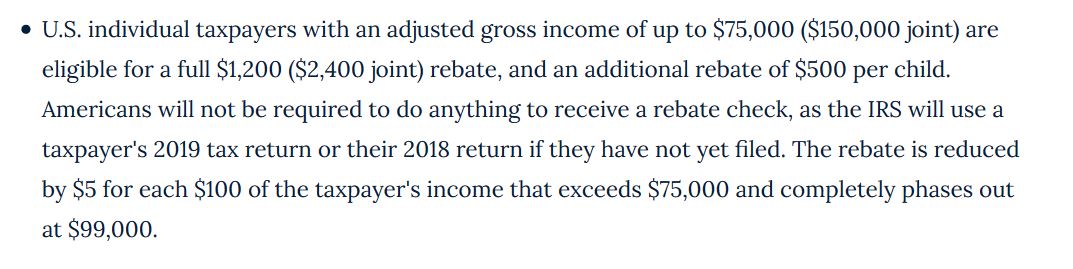 Most of the country’s population is about to receive a stimulus check: $1,200 per tax-paying adult and $500 per child. That means a household with total income under $150,000 and two children will get a check for $3,400, courtesy of COVID-19. Details pasted below: