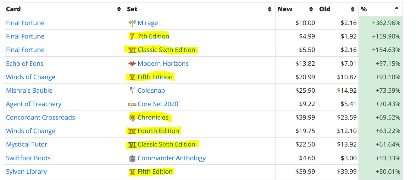 Winds of Change copies, on the other hand, seems to have spiked most if they were from Fifth Edition or Fourth Edition. Legends copies also jumped but they moved just 47% vs. the 93% and 63% jumps of the two white-bordered printings.