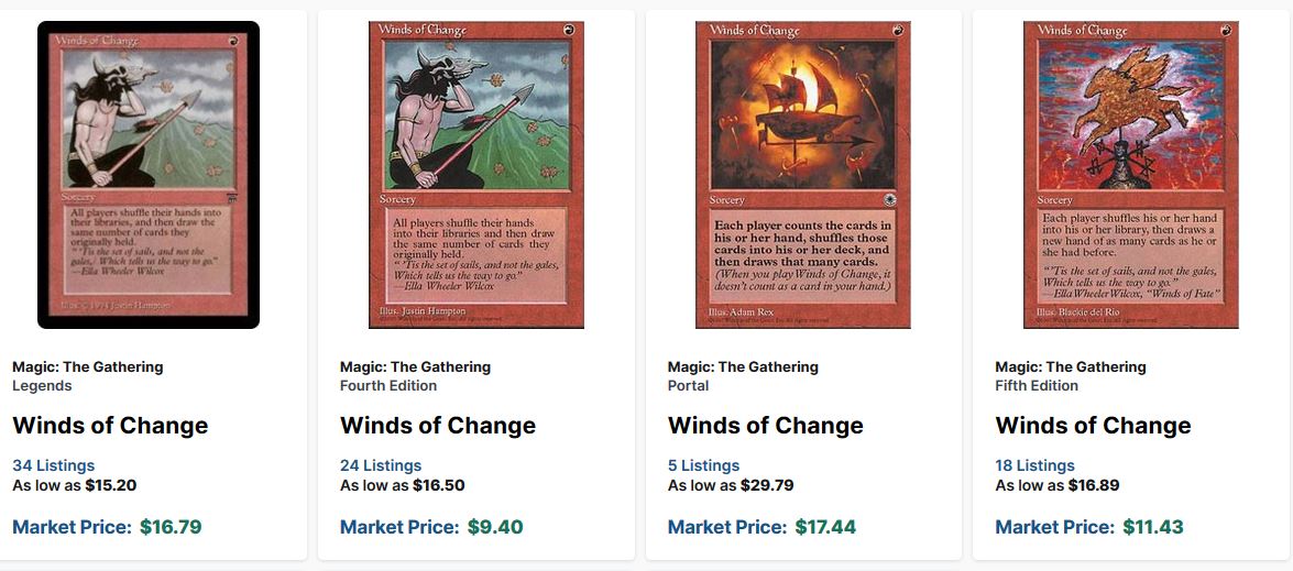 If you guessed the black-bordered, original Legends printing, I don’t blame you. That seems like the most logical guess. What isn’t logical is that, if you want to purchase the cheapest English Winds of Change copy on TCGPlayer, you’d be buying a heavily played Legends copy. That’s right, the Legends copies available for sale start at the lowest price.