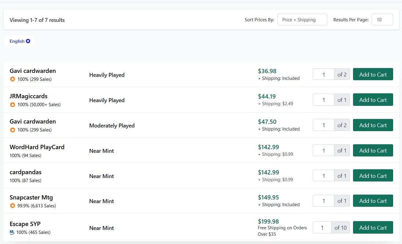 The card had been largely bought out, that was for sure. But the nature of TCGplayer’s (and therefore, MTG Stocks’) pricing algorithm was creating the artificially inflated price. TCGplayer calculates its pricing using an average of lightly played and near mint listings. Let’s take a quick look at Pixie Queen’s English TCGplayer listings as of Sunday, August 16th: