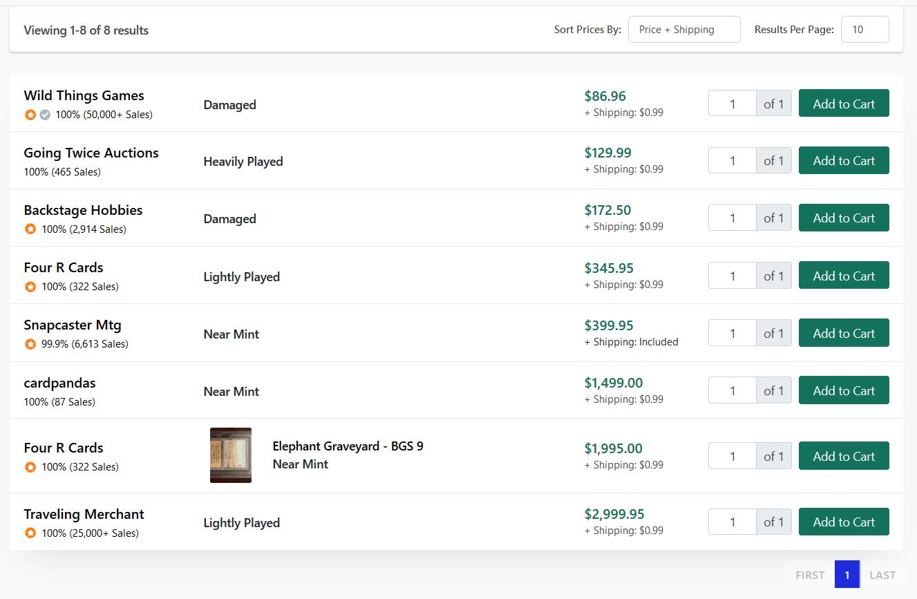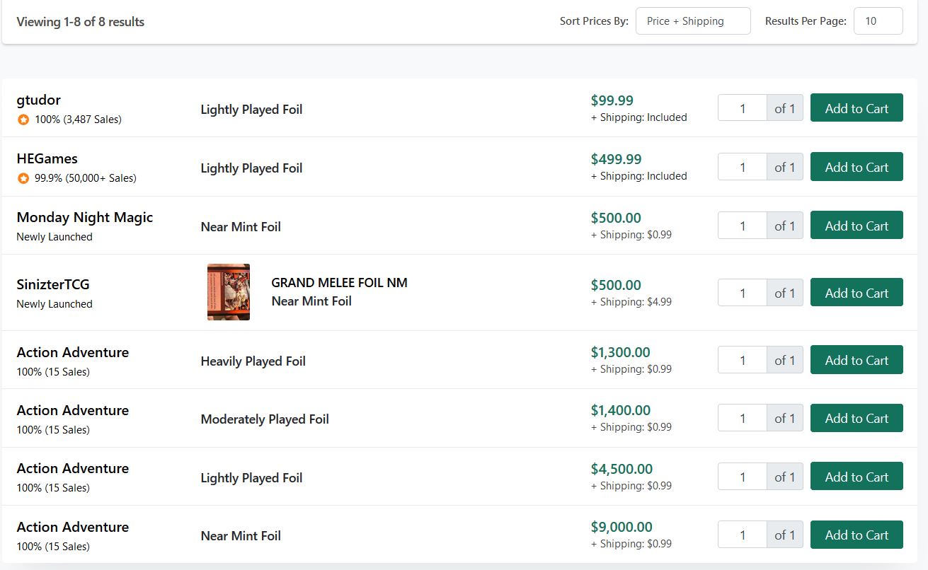 But remember that by doing this, you’re contributing to the buyout even if unintentionally. These market manipulators buy out lightly played and near mint copies on TCGplayer, leaving behind the silly copies listed at $2000 or what have you. The price “spikes” according to MTGStocks, and others buy up the HP/MP copies, as well as any copies at the old price across the internet, and the buyout is thus completed.