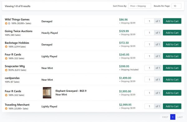 Prior to the spike, this was a $116 card (for LP/NM copies). The damaged listing isn’t completely unreasonable, at $86.96. And the cheapest LP copy isn’t completely offensive, representing a 3x premium versus the old price. If enough people experience FOMO, that copy could sell. But look at the bottom three listings: $1499, $1995, $2999.95?!