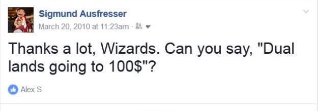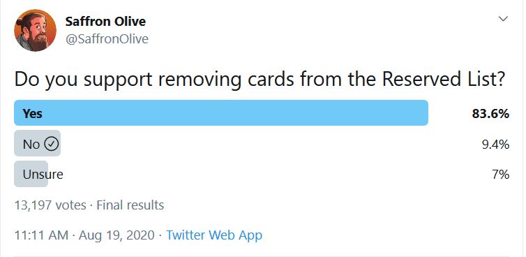 Iâm not sure who this âcommunityâ was that WOTC referred to. Certainly this isnât the same community that participated in Saffronâs Twitter poll. That community would have clearly supported premium foil reprints of Reserved List cards. Some influential group of people must have had WOTCâs ear in order to motivate this update. At the time, that influential pro-Reserved List group didnât include me, hence my frustrated Facebook post.