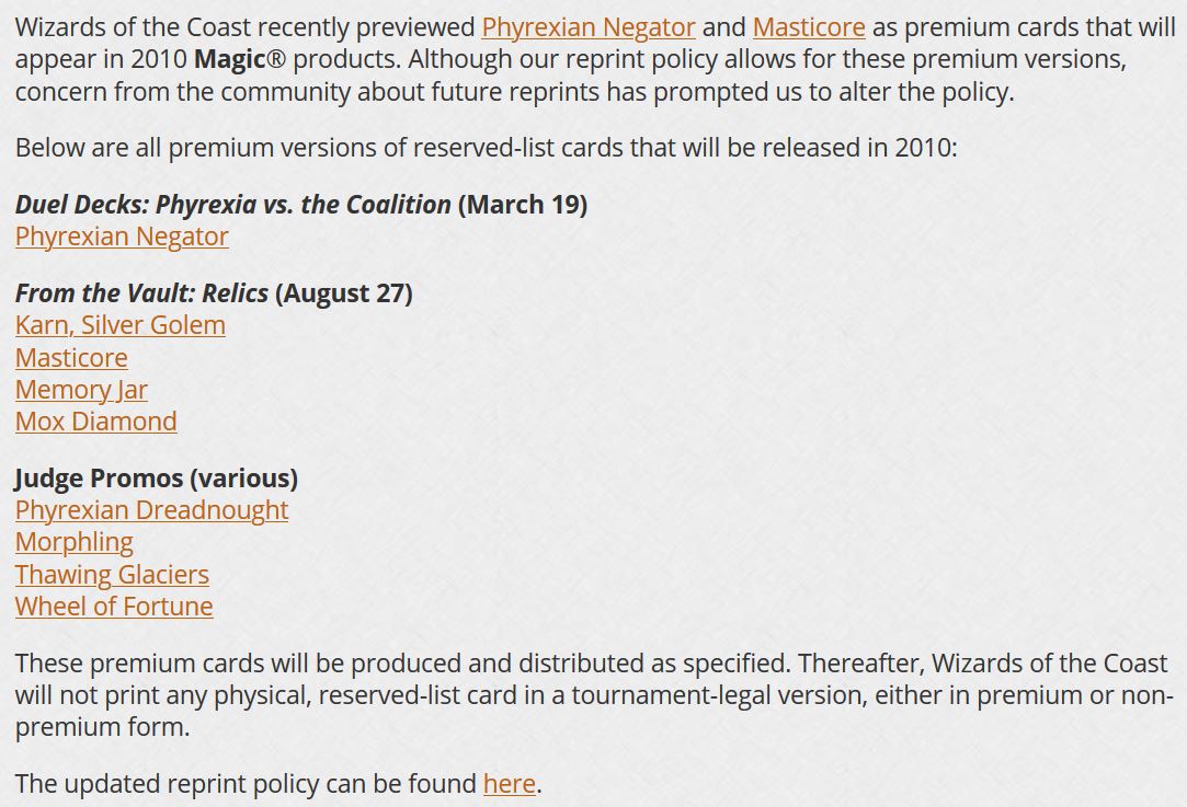 What happened in March 2010 that catalyzed this post? Just two days prior, on March 18th, Wizards of the Coast posted a significant update to the Reserved List. The post was short and unassuming; in fact, itâs so short, I can paste the entire announcement from their website right here.