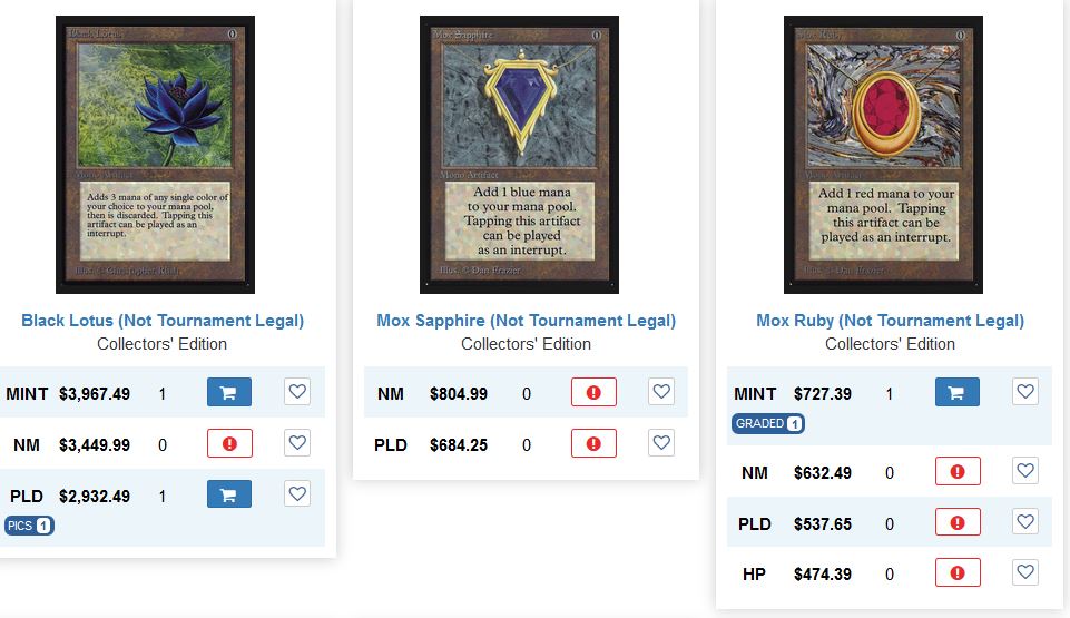 A $2932.49 played CE Black Lotus is about 30% higher than the market. And while that “MINT” CE Mox Ruby may be tempting if you have store credit to cover the $727.39 price tag, I’m pretty sure that card is really worth only about $500. It seems, in some cases, ABUGames has already adjusted their prices upwards on the most desirable CE/IE cards.