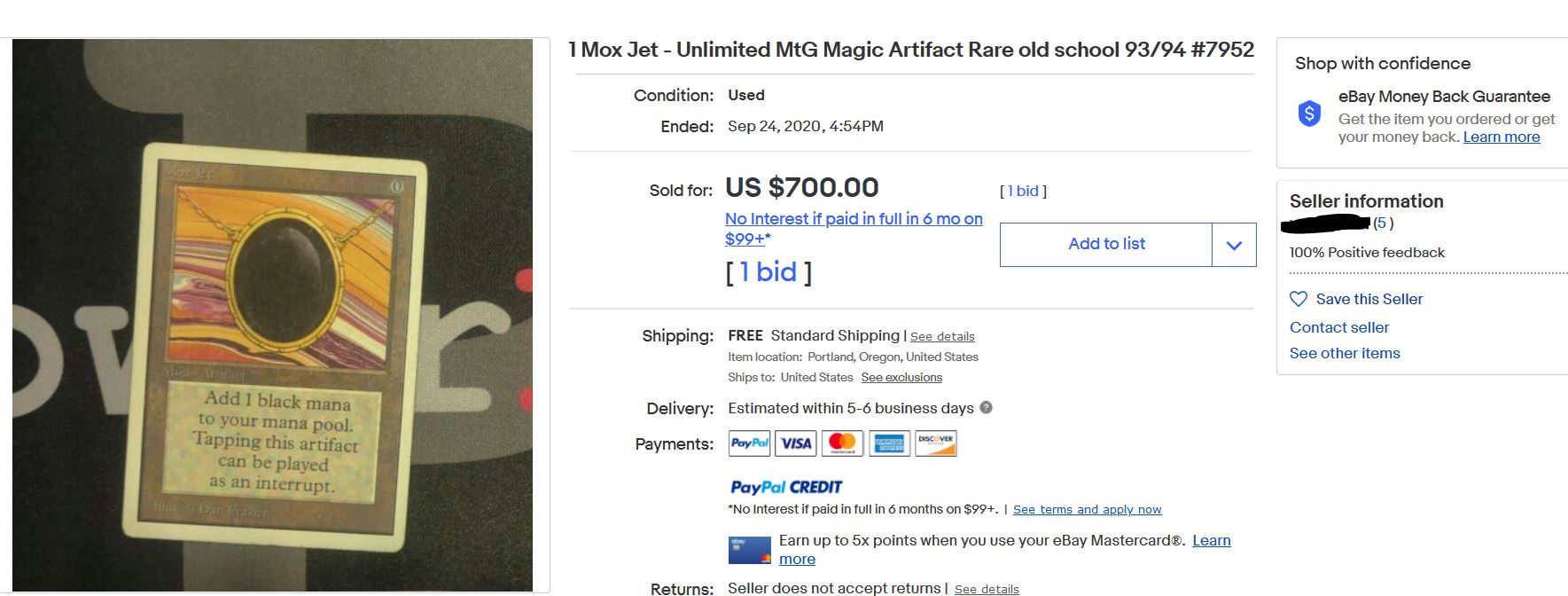 There are multiple red flags here. First, the seller’s feedback rating is 5, which is extremely low for someone selling Power on eBay. I wouldn’t go near a piece of Power sold by an eBay seller with less than a few hundred feedback. But the most glaring issue here is the picture—it’s one of PowerNine’s pictures! This seller basically took PowerNine’s listing, copied it, and set the price to $700. I can pretty much guarantee the buyer of this listing did NOT get the Mox Jet pictured.