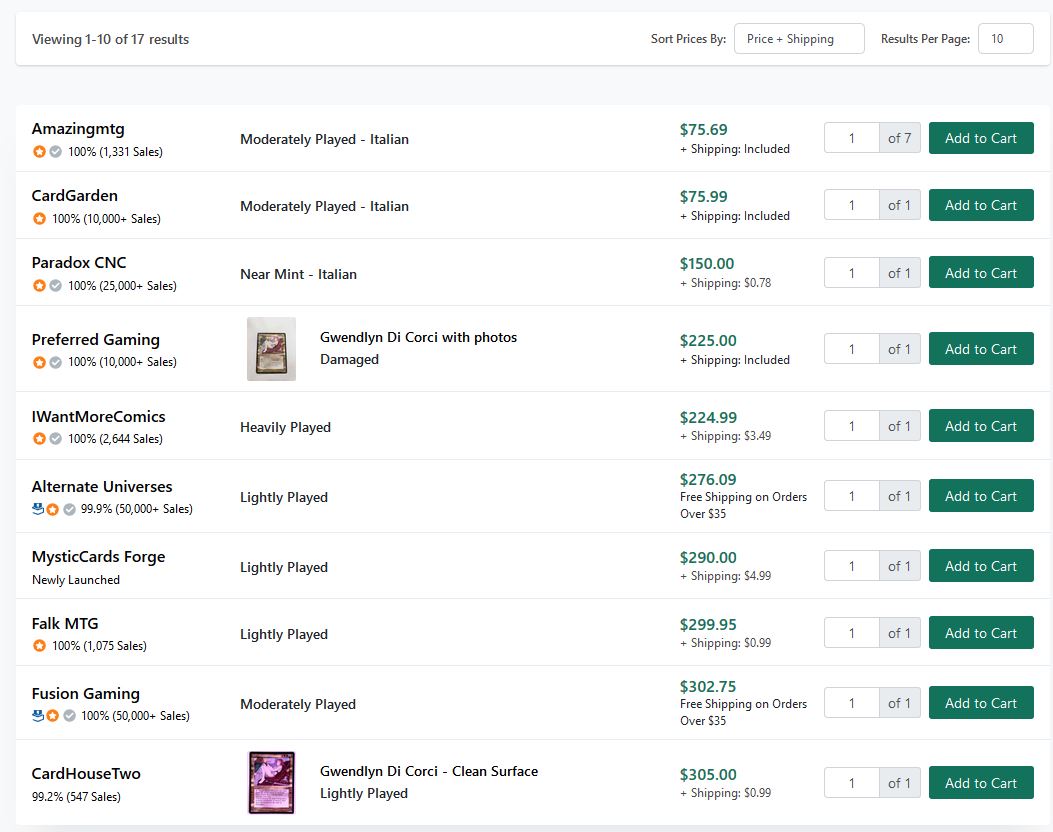 What happened was Gwendlyn Di Corci was bought out. My hypothesis is that a few folks experienced FOMO and panic-bought whatever copies they could find while they were virtually sold out on the internet. The result: a few outlying data points of sold listings. Does this mean Italian Gwendlyn Di Corci is now worth $200? Hardly. If I was a buyer or seller of this card, I would take these outliers with a grain of salt, and use other sources (TCGplayer, ABUGames, Star City Games) for cross-references when determining pricing. TCGplayer’s listings are below, for example.