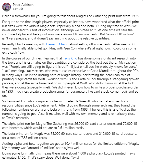 The post came from WOTC founder Peter Adkinson, and it quantified more precisely the initial print run of Alpha.