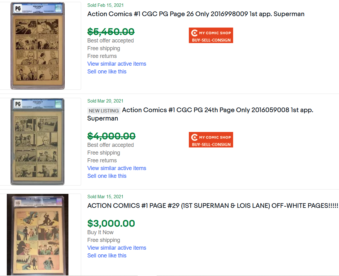 One may ask what the print run was on this three-million-dollar comic book. According to Wikipedia, the print run for Action Comics 1 was 200,000, nearly twenty times that of an Alpha rare! So if these are so relatively plentiful, why are they so expensive? I can’t find any recent eBay sales of an Action Comics 1, but it looks like a few single pages from Action Comics 1 sold for a few thousand dollars each on eBay.