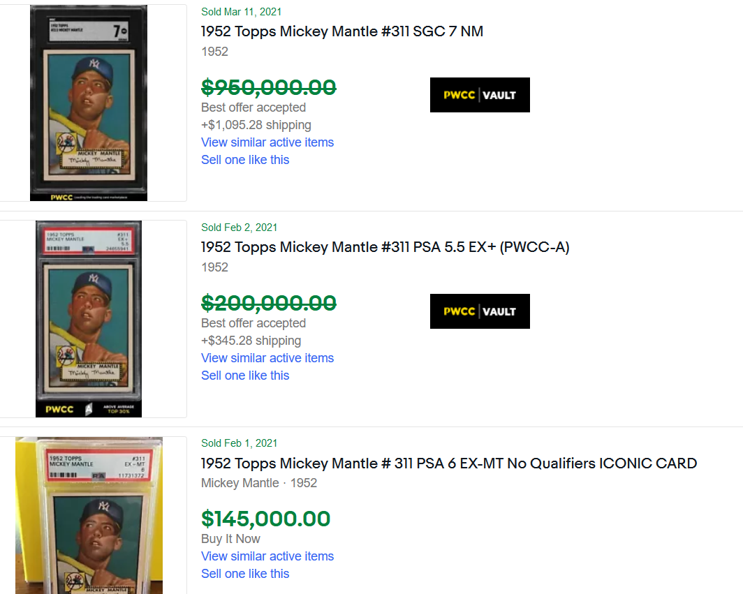 Let’s instead compare Alpha to another highly desirable, chase baseball card: the 1952 Topps #311 Mickey Mantle card.