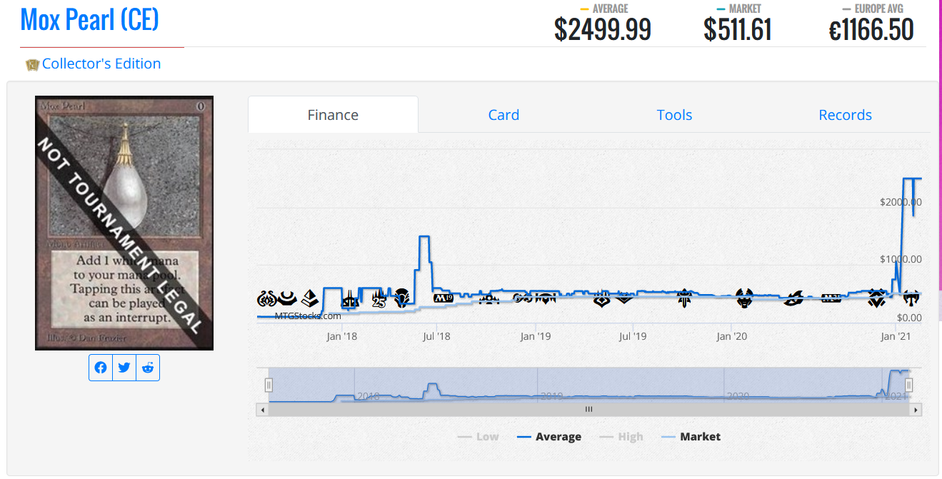 One great example here is my decision to sell my Collectors’ Edition Mox Pearl. The MTG Stocks chart makes the card’s price look higher than it truly is, but the general trend is accurate.