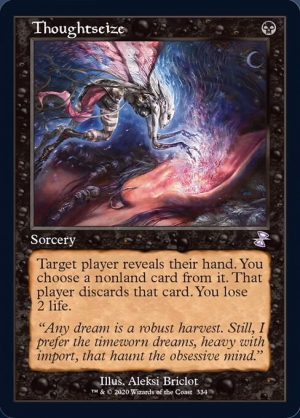 I definitely shouted a little bit in the office at my new day job when Chroberry sent me the spoiler for the Timeshifted Thoughtseize. I've always been a huge fan of Aleksi Briclot's gnarly Thoughtseize art, and I think it looks absolutely spectacular Timeshifted like this. It'll likely cost me a pretty penny, but upgrading my Thoughtseizes to the Timeshifted version is high on my to-do list when TSR drops.