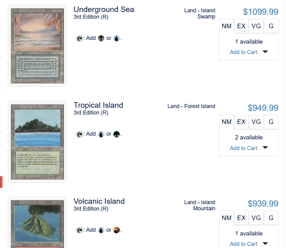 Do not be deceived by their near mint inventory. While they may not get many near mint Duals in stock, they have a bunch of played ones. For example, Card Kingdom has eight EX, VG, and G copies of Underground Sea listed. Though oftentimes I see them cap their quantity restocked at eight per condition—if I had to bet, I’d guess they had more waiting in the wing.