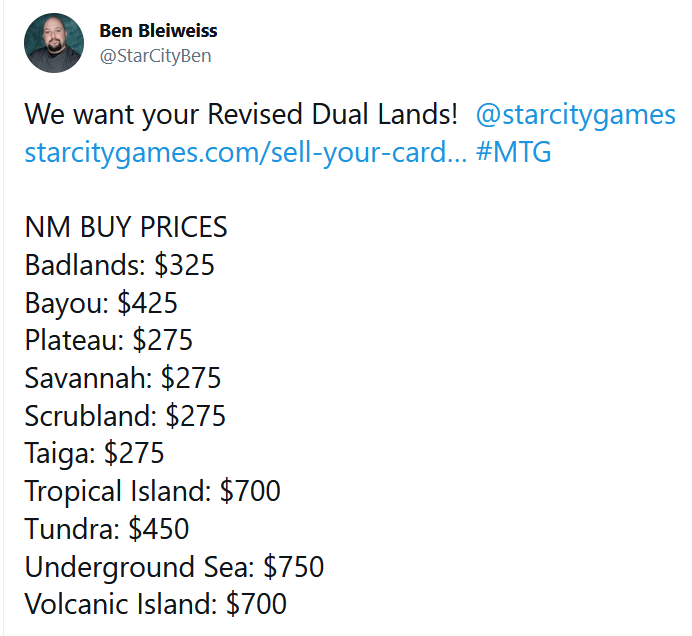 In reality, this has not played out (yet, at least). At one point, top buy price on a Revised Underground Sea peaked at $780. Now, the top buy price is down to $577.50 according to Trader Tools. Card Kingdom’s buy price isn’t even best in class anymore. Their offer: $550. Star City Games has been aggressively playing in the Dual Land market as well—remember when SCG buyer Ben Bleiweiss tweeted out their buy prices on Duals back on February 1st?