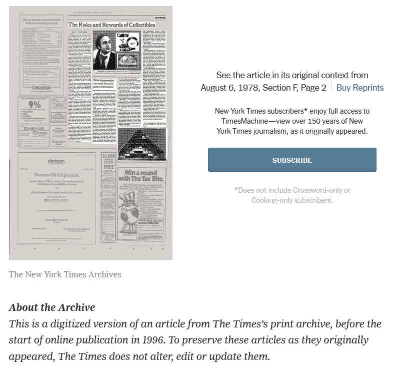 When I googled the impact of inflation on collectibles, this was one of the first matches: a New York Times article from 1978. How relevant is this article to the Magic market, which didn’t even exist until 1993? Surprisingly, there are some pretty valuable nuggets of insight!
