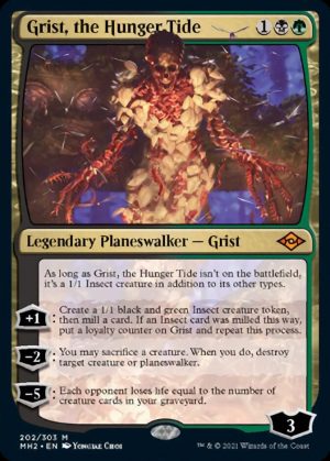 Grist, the Hunger Tide is one of the coolest designs for a planeswalker that we've seen in a long time. Because of it being a 1/1 Insect whenever it's not on the battlefield, it can be your commander, it can be found by all kinds of spells that normally couldn't find a planeswalker, and it is primed for all kinds of wacky three-mana planeswalker Shenanigans (which is also getting a reprint in this set at uncommon)!